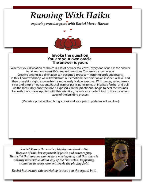 WORKSHOP Currently, there are no public workshops scheduled, see below for a description of Running With Haiku TO BOOK A WORKSHOP WITH RACHEL PLEASE EMAIL: isaac (at) haikuforthought.com Share this:Share Click to share on Pinterest (Opens in new window) Pinterest Click to share on Facebook (Opens in new window) Facebook Click to share on LinkedIn (Opens in new window) LinkedIn Click to share on X (Opens in new window) X Click to share on Tumblr (Opens in new window) Tumblr Like Loading...